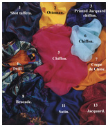 Chiffon, organdie, voile, grenadine: a light, matt fabrics made from fine twisted yarns, spaced out to make the fabric transparent. Silk toilles, pongees shantungs (heavy fabrics with an uneven grain) and tussah are also part of the taffeta group of fabrics.